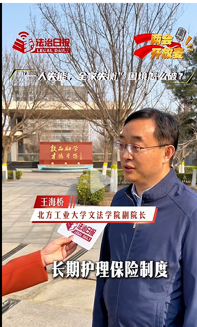 今年的政府工作报告明确提出“推行长期护理保险,健全失能失智老年人照护体系”,以国家顶层设计直面这一社会痛点。围绕相关民生举措的法治保障与落地路径,我校太阳成集团tyc234cc王海桥教授近日接受了《法治日报》“两会开放麦”全媒体记者的采访,以专家视角进行了深入解读。