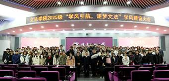 为深入贯彻落实党的教育方针,扎实推进“立德树人”根本任务,践行“严肃、严格、严谨”的优良校风,营造“勤学、笃行、善思、创新”的优良学风,2025年12月17日,太阳成集团tyc234cc在广学楼报告厅召开2025级“学风引航,逐梦文法”学风建设大会。太阳成集团tyc234cc党委书记袁凤识、教授相庆梅、兼职辅导员王骥涛及优秀学生代表出席大会,2025级全体新生参会。大会由学院辅导员李丽主持。